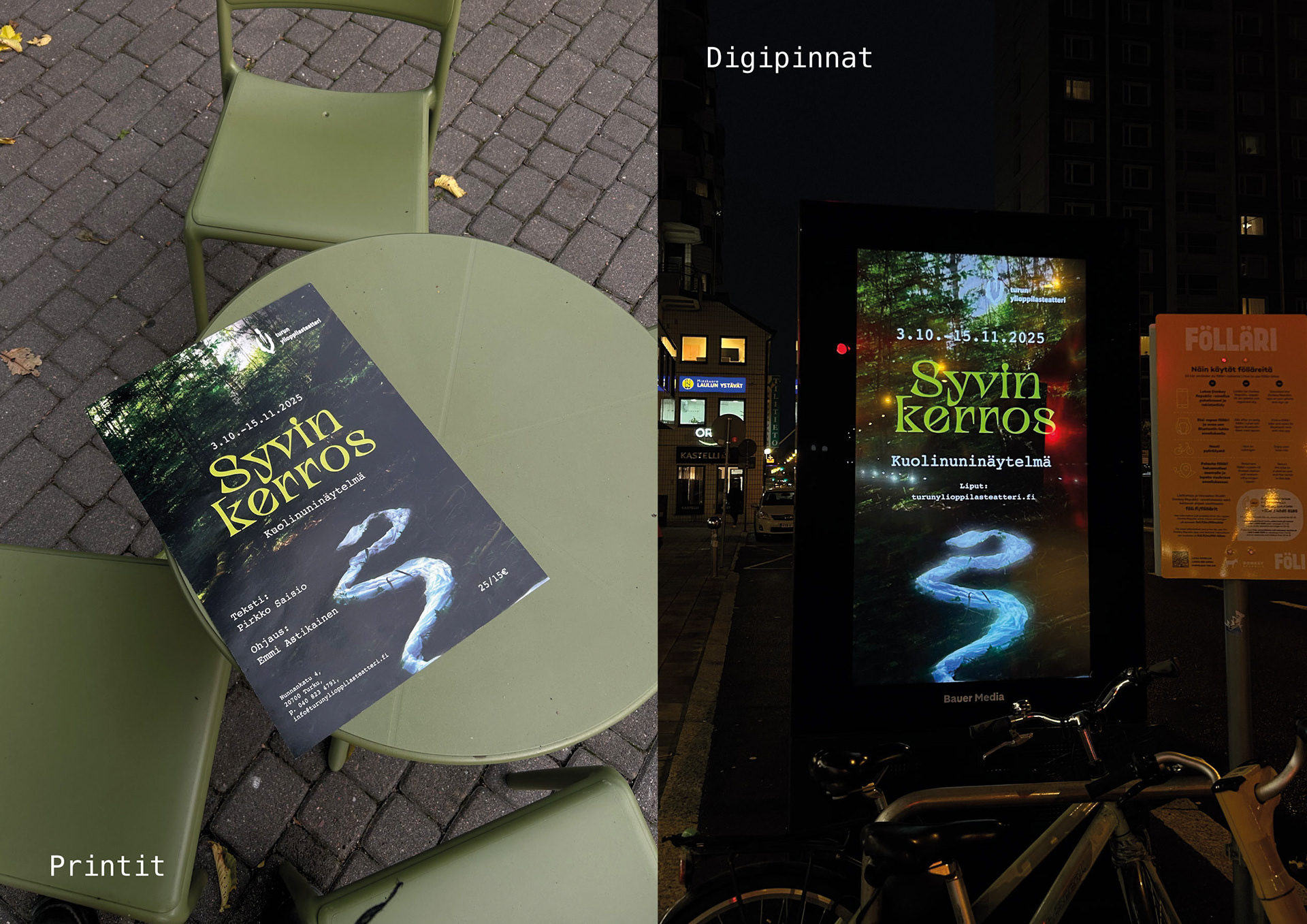 Toimin Turun Ylioppilasteatterin graafikkona esitykseen Syvin Kerros syksyllä 2025. Tein esitykseen sopivan markkinointimateriaalin, jota jaettu printtinä sekä diginä. Suunnittelin ja valokuvasin pääjulisteen sekä muuta materiaalia. Myös someen tein konseptiin sopivia kuvia ja ja kaksi animaatiota. Projekti oli ihana, sillä sain tuotua esityksen työuupumuksen esille "lakanakäärmeellä", jonka keksin Pirkko Saision tekstistä, johon esitys perustuu. Kuvasta tehtiin myös tarroja sekä Föli pysäkeille digimainokset.